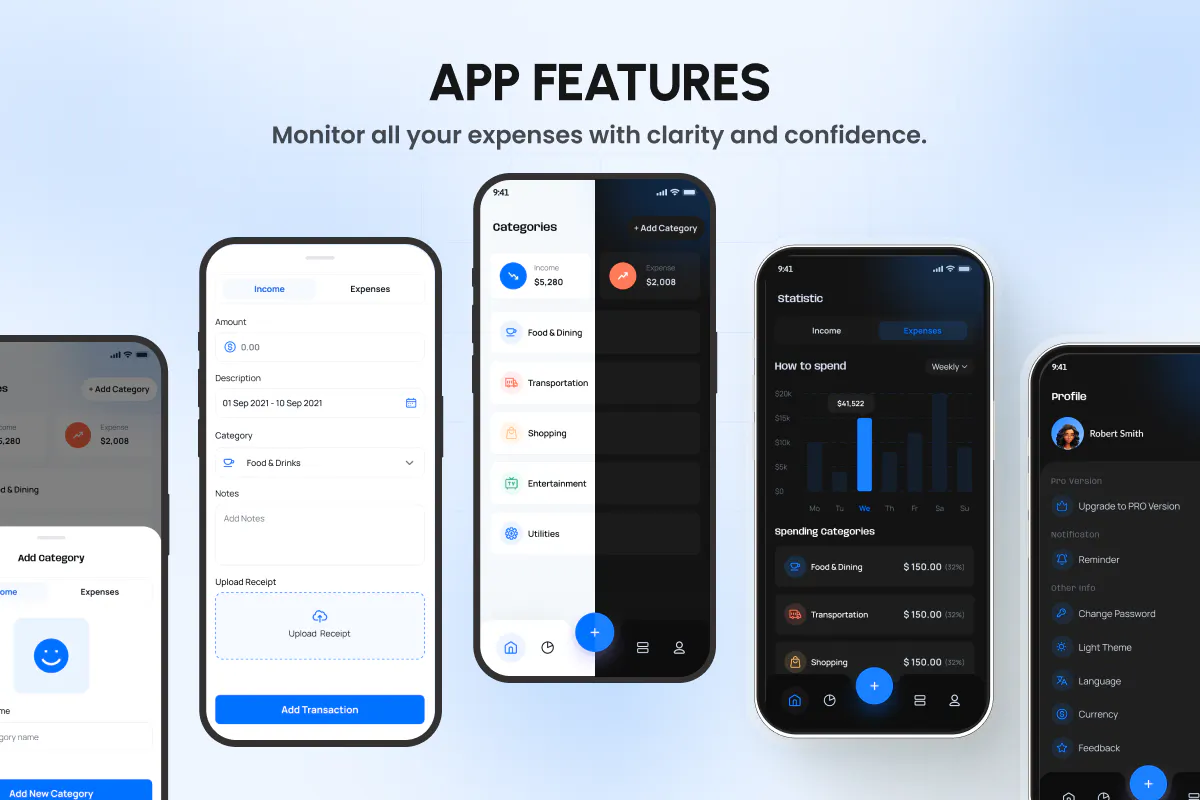 π± 17+ Screens & Components: Comes with all the must-have screens like Dashboard, Transactions, Add Expense, Reports, Profile, and more.