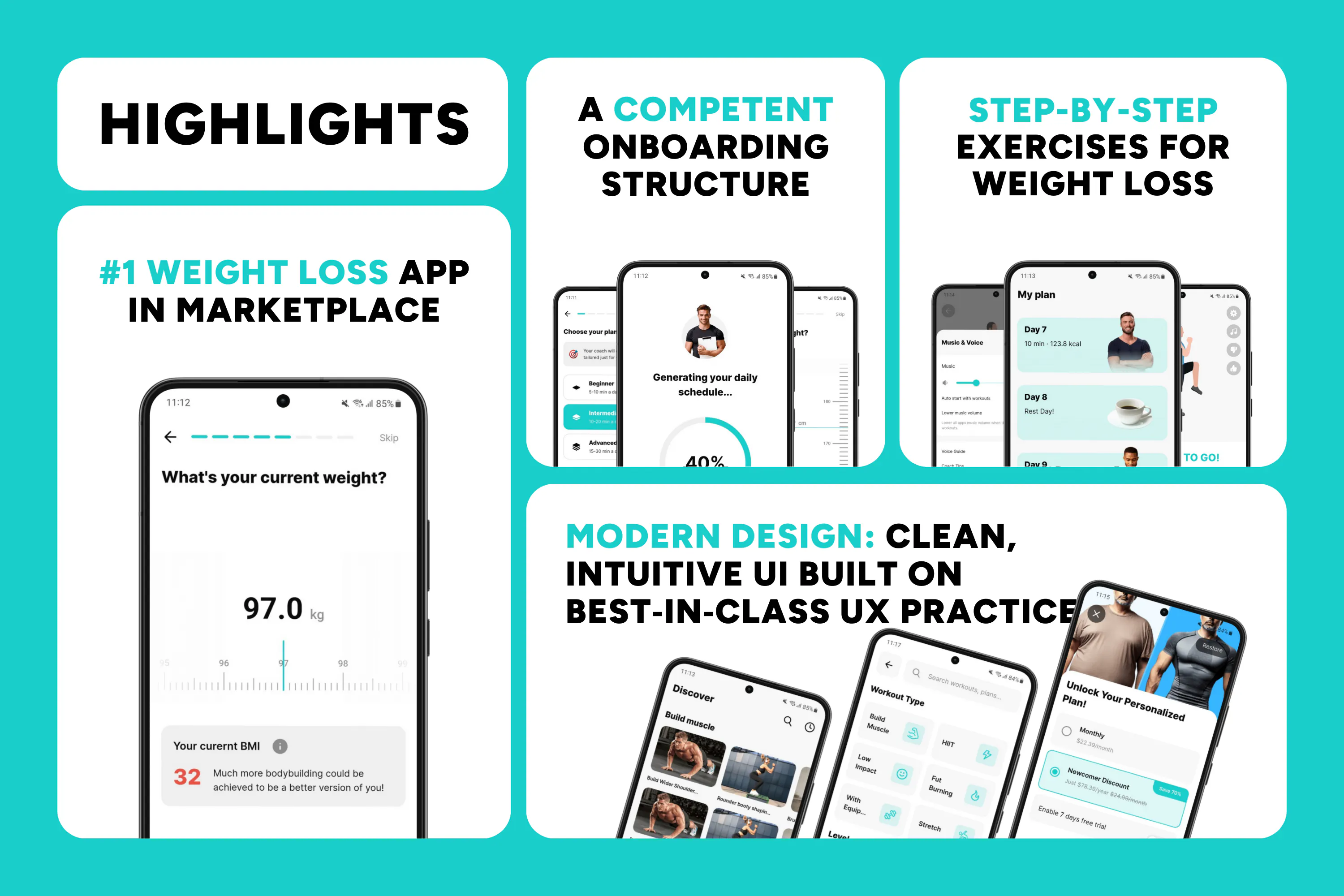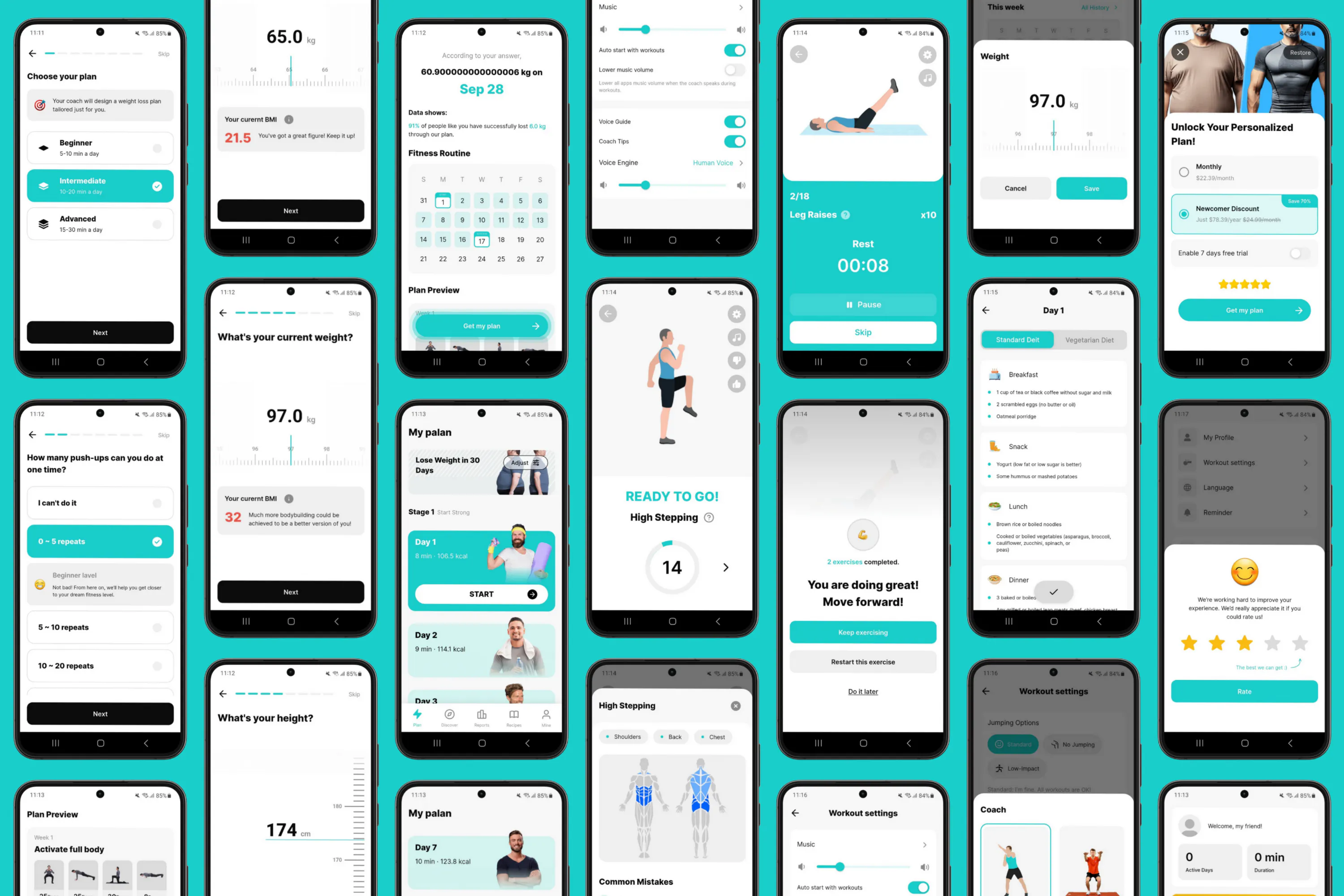 Daily Workouts: Effective fat-burning exercises with guided animations and timers.