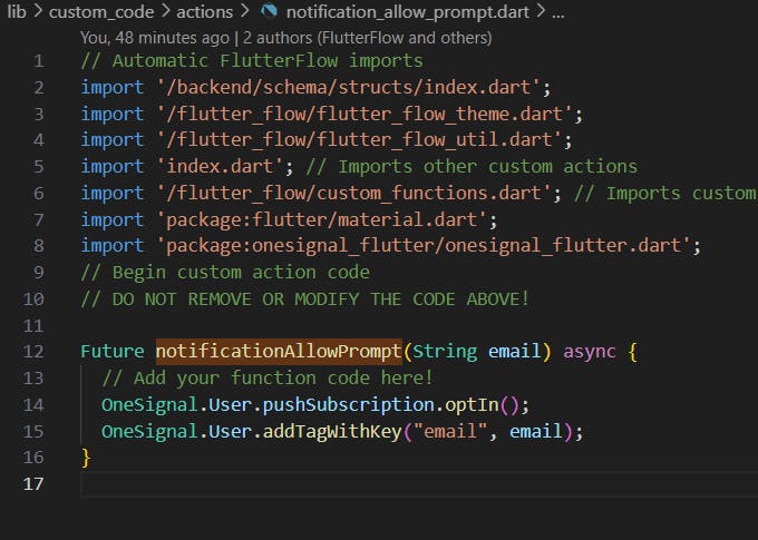 import 'package:onesignal_flutter/onesignal_flutter.dart';I know the green comment says to not modify the code above blablabla, but you'll have to add this otherwise it won't work.
