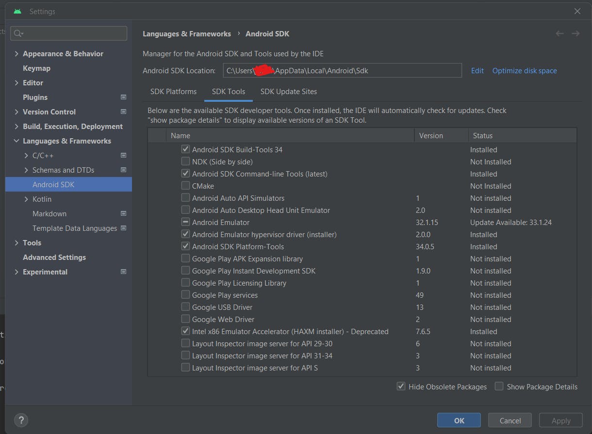 Step 6: Make sure you have VSCode and an Android SDK installed, as we will test this on Android first. Instructions of how to install these are online. I installed Android Studio because it's easier to manage the SDK like this.