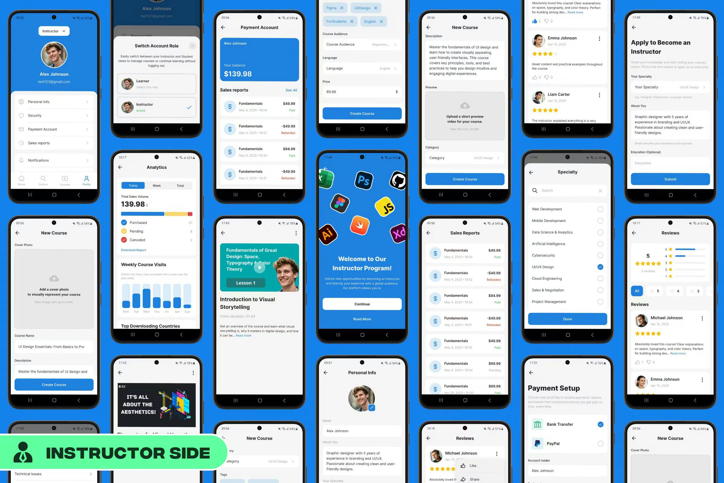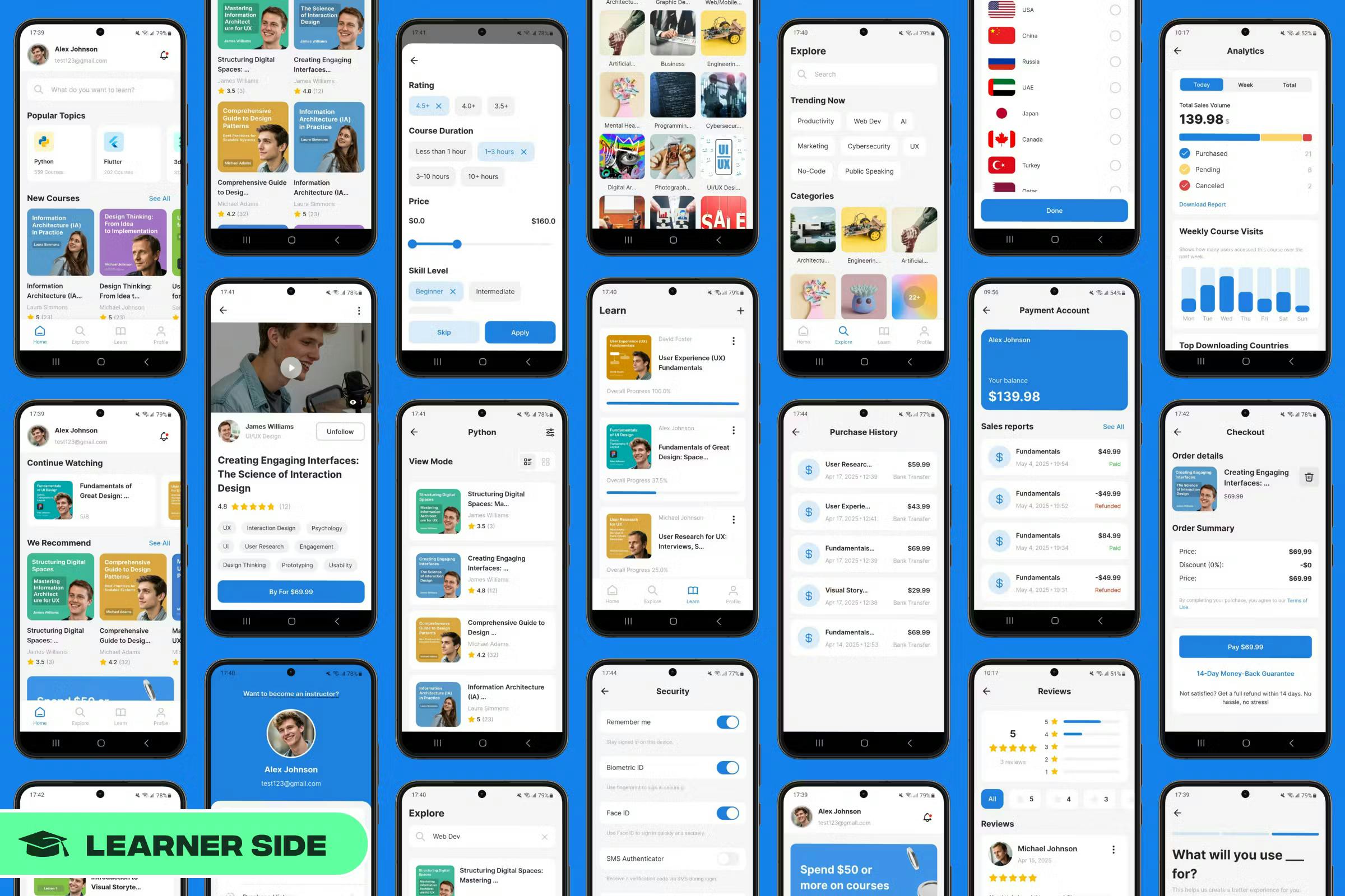 π©βπ Learner Side: Beautifully designed screens to explore, enroll, and track course progress with personalized dashboards, ratings, and smooth video playback.