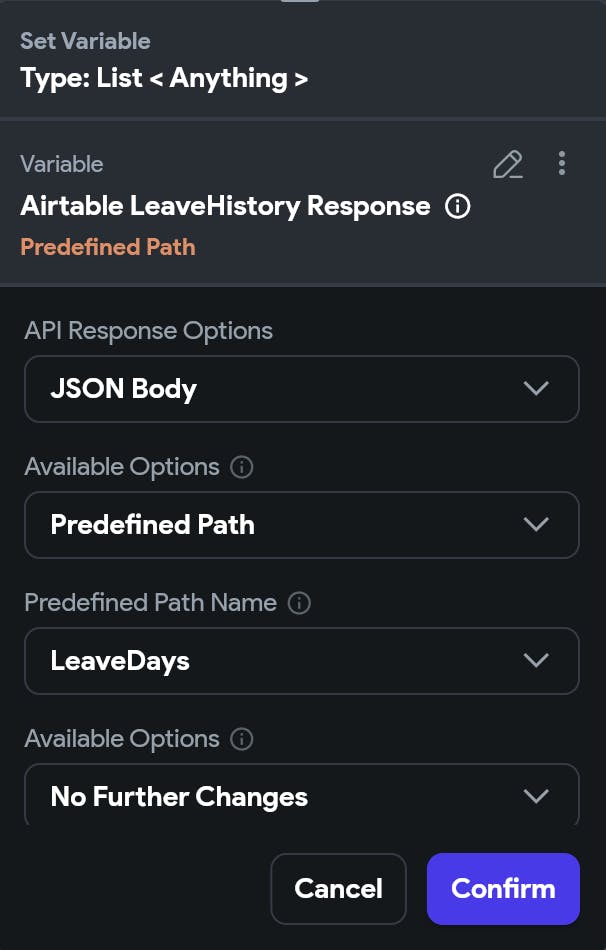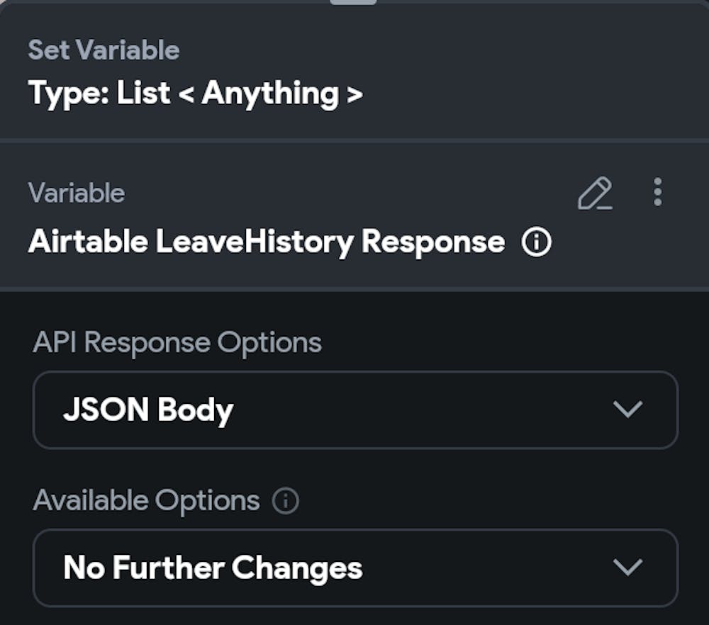 On the 2nd page, I call an API and use a variable on the URL (https://api.airtable.com/v0/apikeyhere/table2?filterByFormula=EmployeeName%3D"[userName]")) -> as shown below screenshot