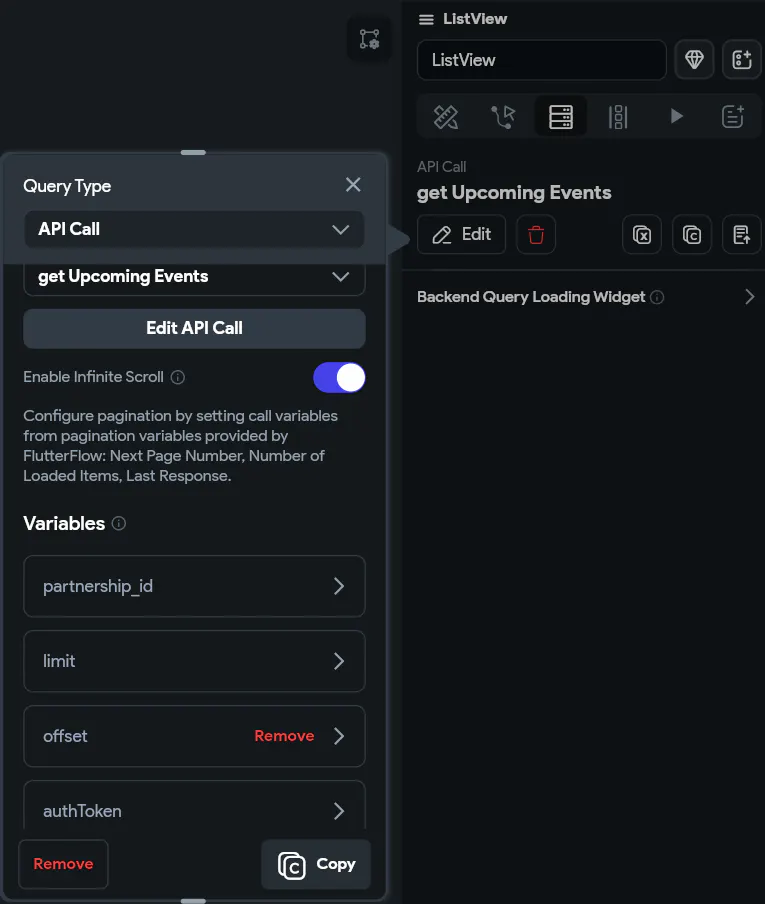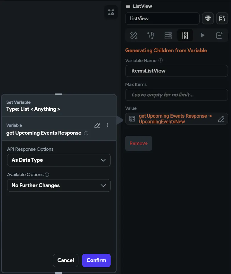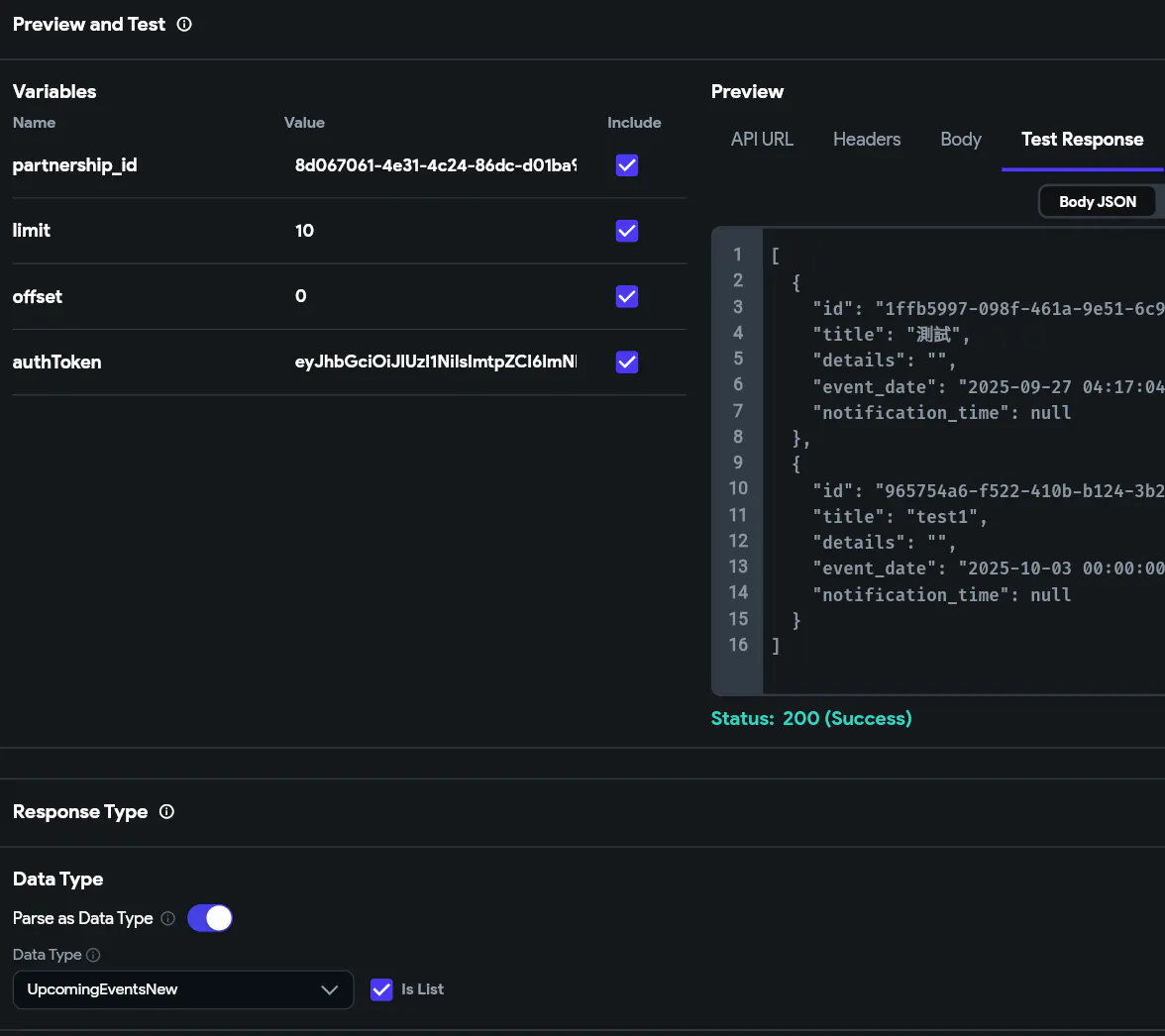 Main Problem: Api call test & response is functioning perfectly, and all Data Type fields are well set. The ListView widget is also properly set (with all necessary variable and parameter). However, the ListView widget just doesn't render (keeps showing the loading indicator) in Test Mode.