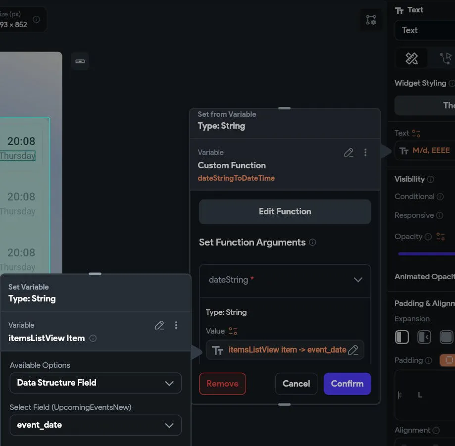 }First of all: if you should make sure your function and Api call are set properly (ex. return values; "is List" or not; using "parsed as Data Type" or not (no need to set any JSON path btw) and all the field names in your Data Type need to match your Supabase column name/the keys in the JSON response from your function. Then, make sure you set your ListView widget correctly. (Picture 1,2,3,4)