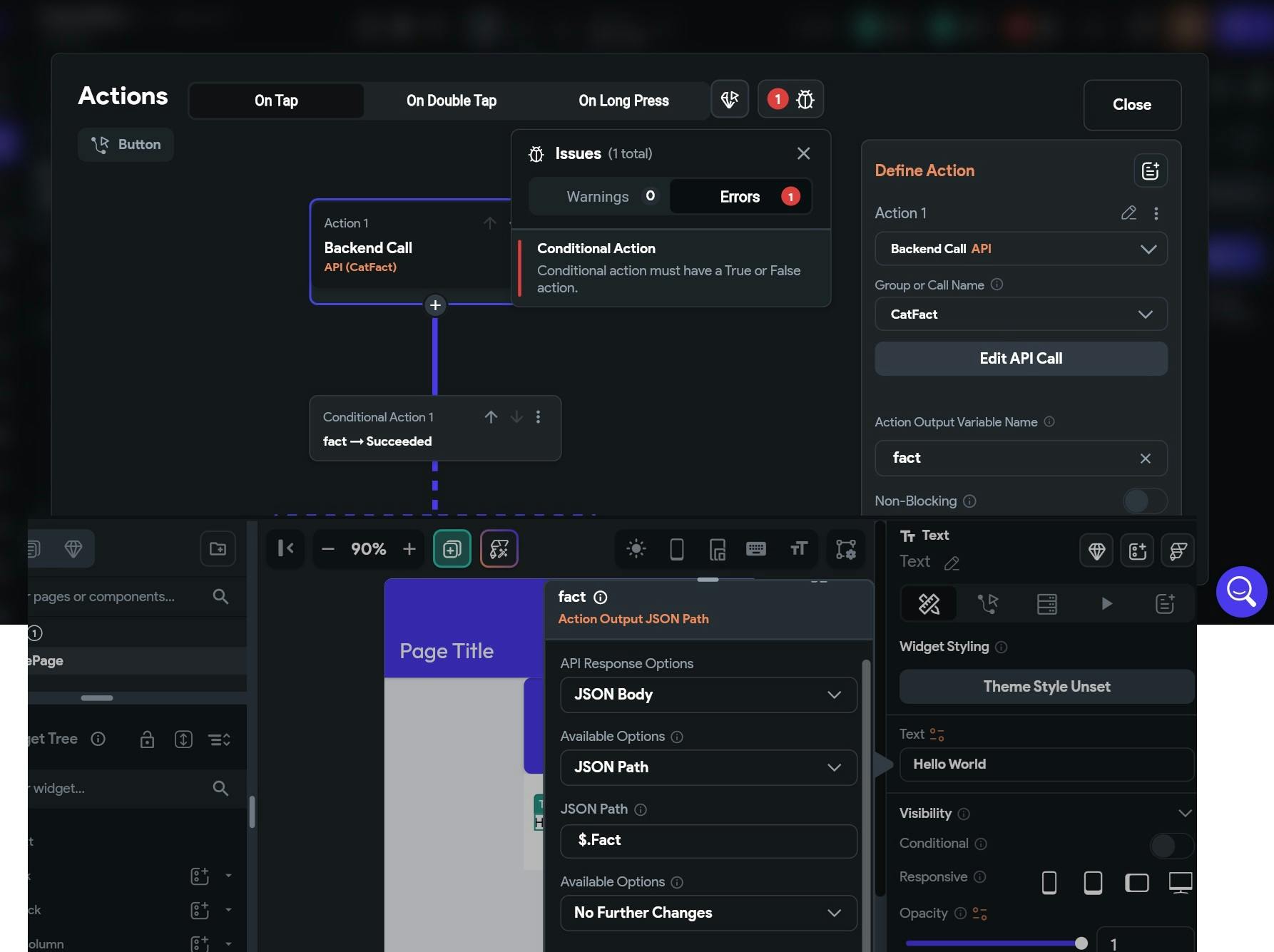 I have connected the API correctly and it works when i run the test. Ive had success connecting APIs on the backend and testing them but once i create a "button" with an "action", the information never comes through. Currently on my app I created a "button" that when you click it should bring a "$.fact" about a cat but it just doesn't work. I watched a video and im pretty sure everything is in correctly. I see there is an error that says "conditional action must have a true or false action" but im not sure what else to do. See attached screenshots. Would love some help from anybody. thanks