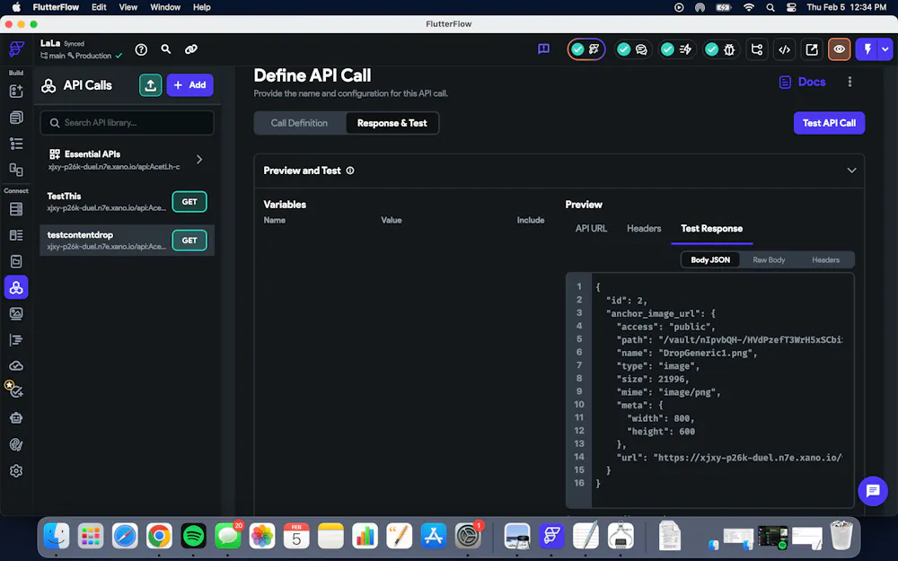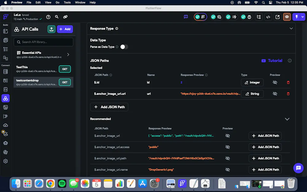 The API test response is successful (status 200), and my JSON displays appropriately. I select relevant JSON paths and name them (example "id" and "url"). The most basic thing I'm trying to set up is just a simple API to pull an image (via image url) from my database. This API doesnt even require inputs.