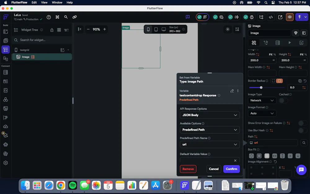 In Flutterflow, I have tried many methods but in my most straight forward method, I used an image widget, I add a backend query to that preset API call, I then set image type: network and put the path as the predefined JSON path "url". I've also tried typing the specific JSON path instead of using predefined.