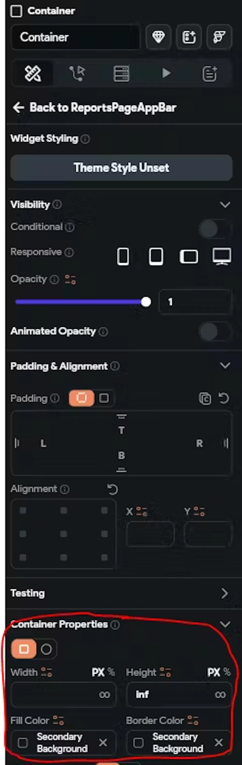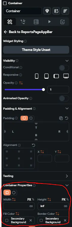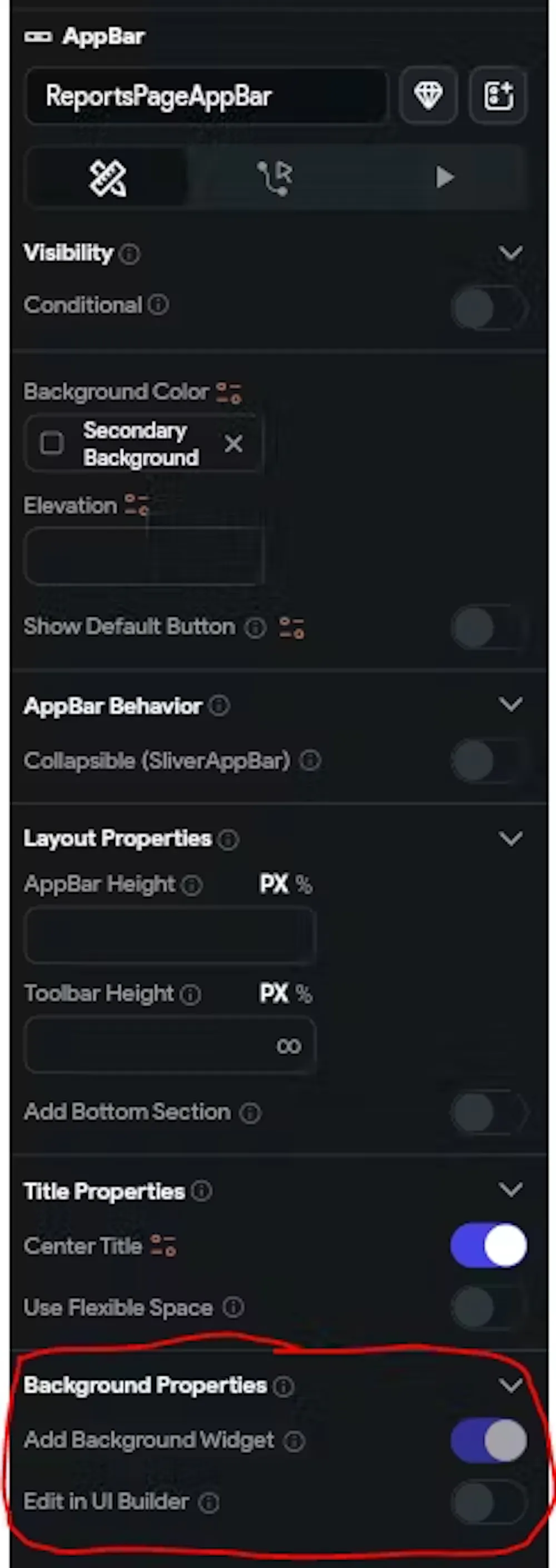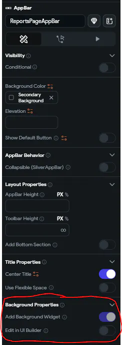 2) In the AppBar properties "Background Properties" enable "Add Background Widget" and "Edit in UI Builder"
