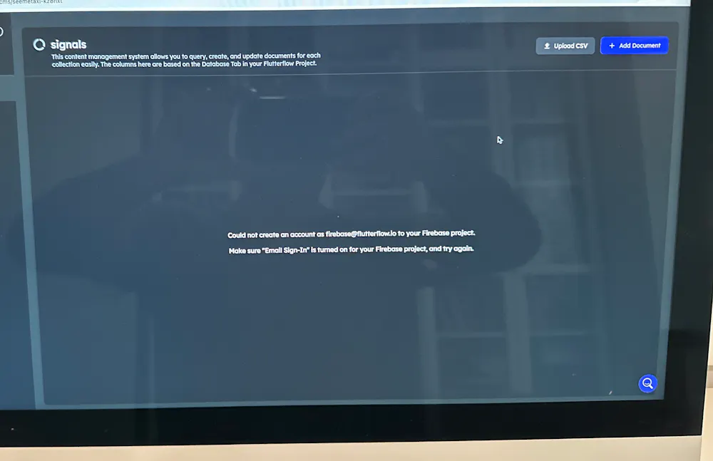 When clicking the Manage Content button in the Firestore Data Manager, I repeatedly receive this error:"Could not create an account as [email protected] to your Firebase project. Make sure 'Email Sign-In' is turned on for your Firebase project, and try again."