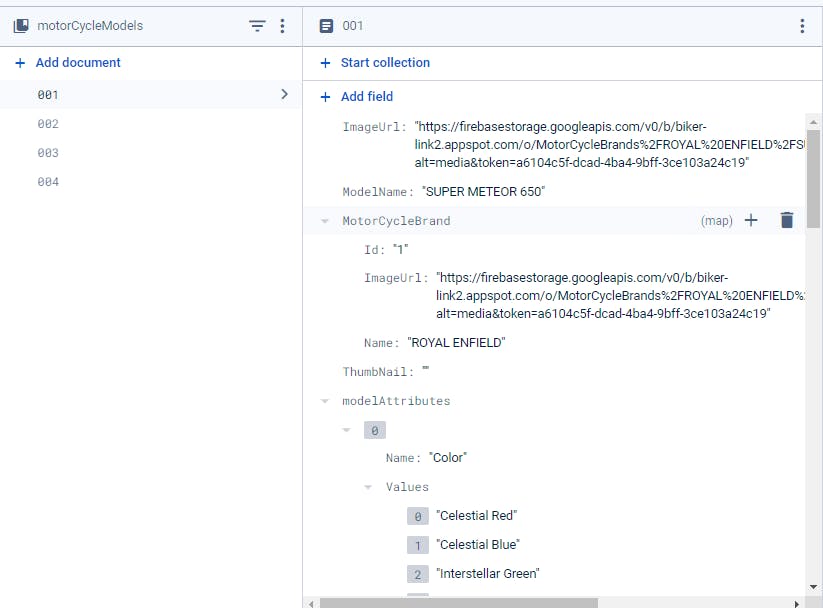 I have a document collection labled motorCycleModels like below , where 001 , 002 are document Id's . Ex - 001 record have few details along with map data like MotorCycleBrand and array data like modelAttributes. How can i query and filter the data in flutterflow.