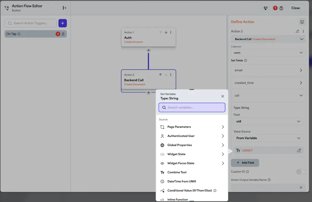 The Problem In Action 2, I try to set the value for my uid field. The problem is that the Action Outputs variable source is not appearing in the "Set from Variable" dialog. Without this, I have no way to get the uid from the first action.
