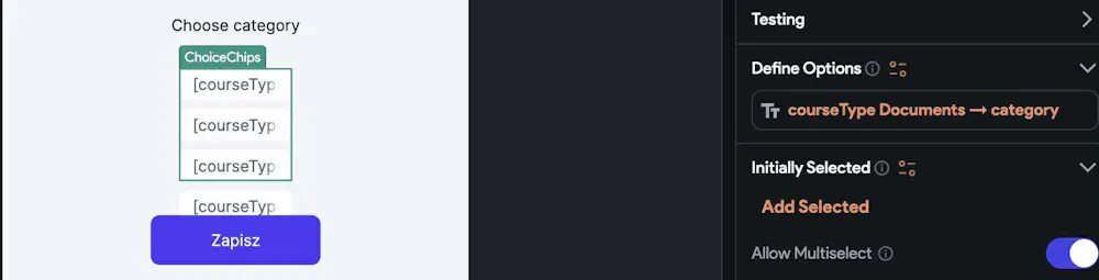 In my FlutterFlow app I’m using a ChoiceChips widget to let users select course categories. Right now the widget displays the category field (string), and when I save the selection it also returns the same string.
