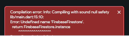 Compilation error: Info: Compiling with sound null safety lib/main.dart:15:10: Error: Undefined name 'FirebaseFirestore'. return FirebaseFirestore.instance ^^^^^^^^^^^^^^^^^ Error: Compilation failed.