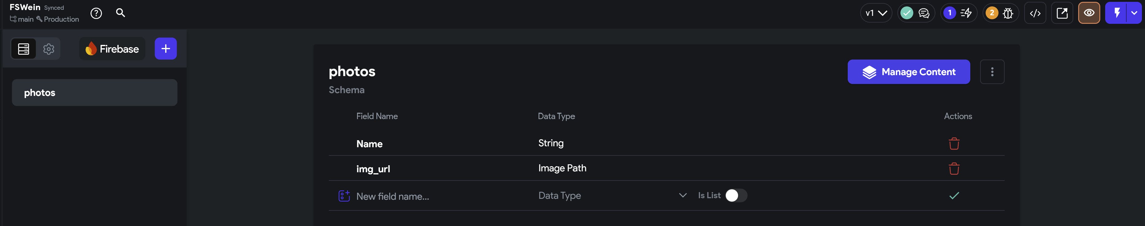 Create a collection "phtos" in Flutterflow collection with fileds "Name" and "img_url"