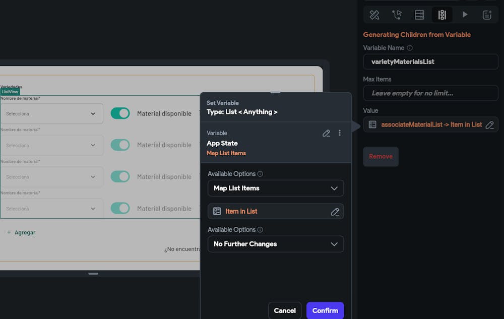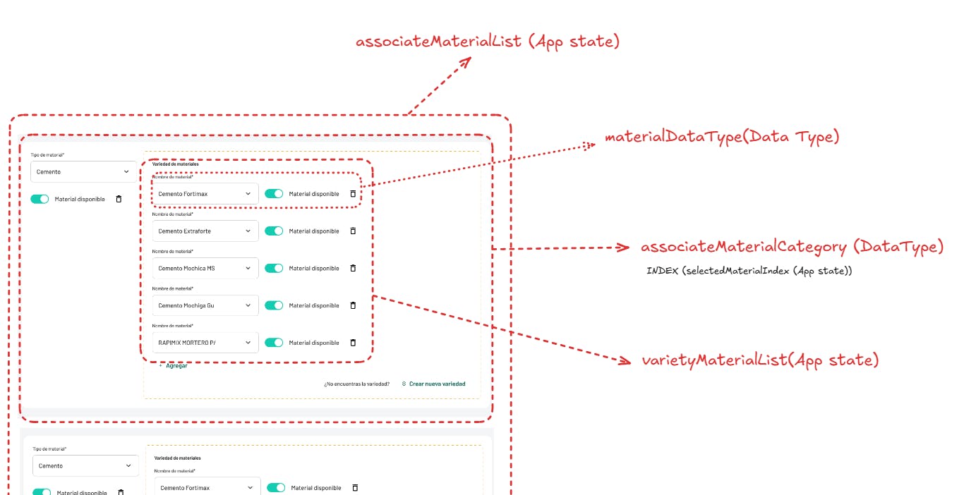 All of this is stored temporarily in the App State variable associateMaterialList: List<associateMaterialCategory> before being saved to Firestore.