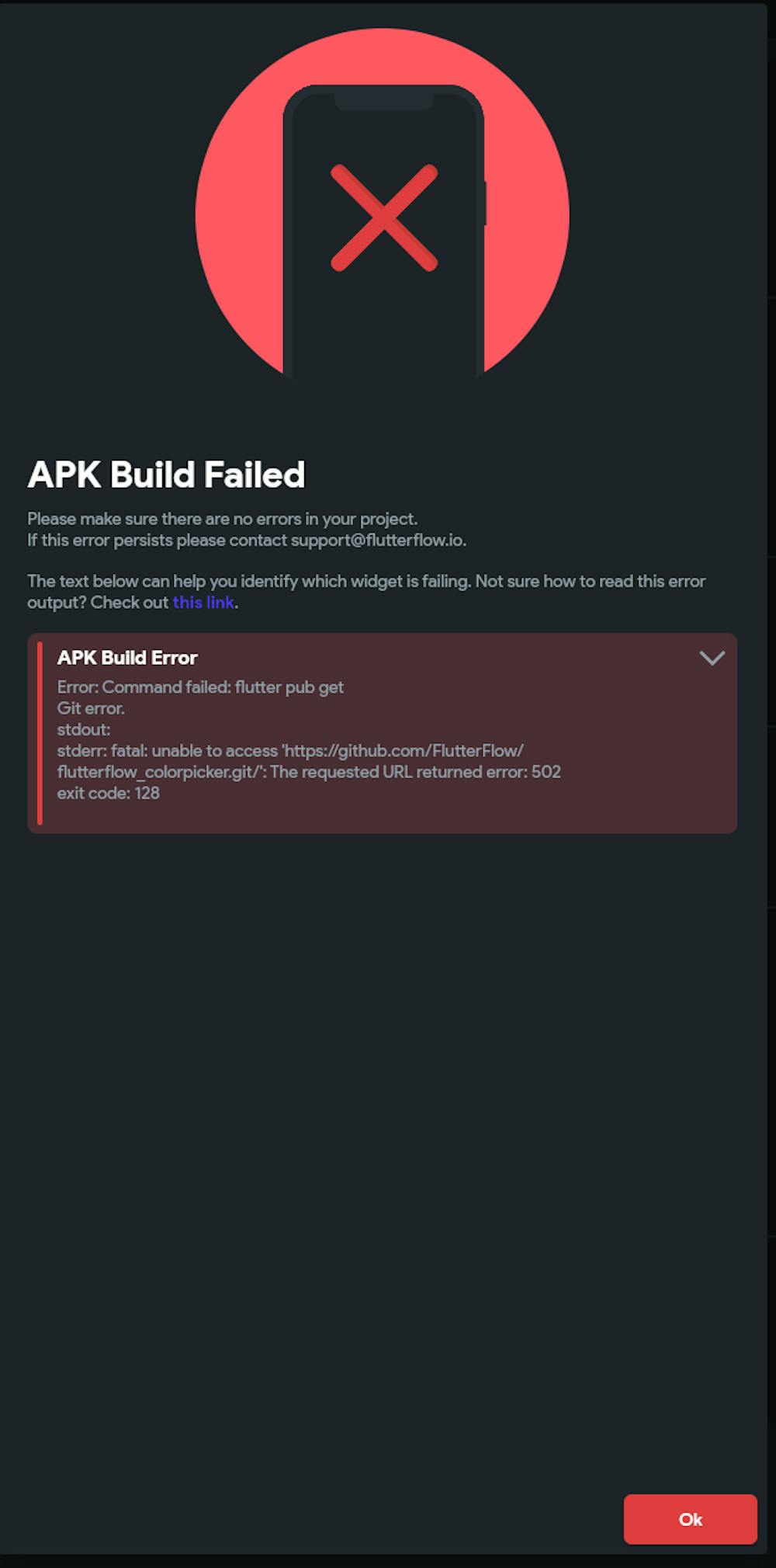 hi i try to Dowloand APK and have the mistake Error: Command failed: flutter pub get Git error. stdout: stderr: fatal: unable to access 'https://github.com/FlutterFlow/flutterflow_colorpicker.git/': The requested URL returned error: 502 exit code: 128