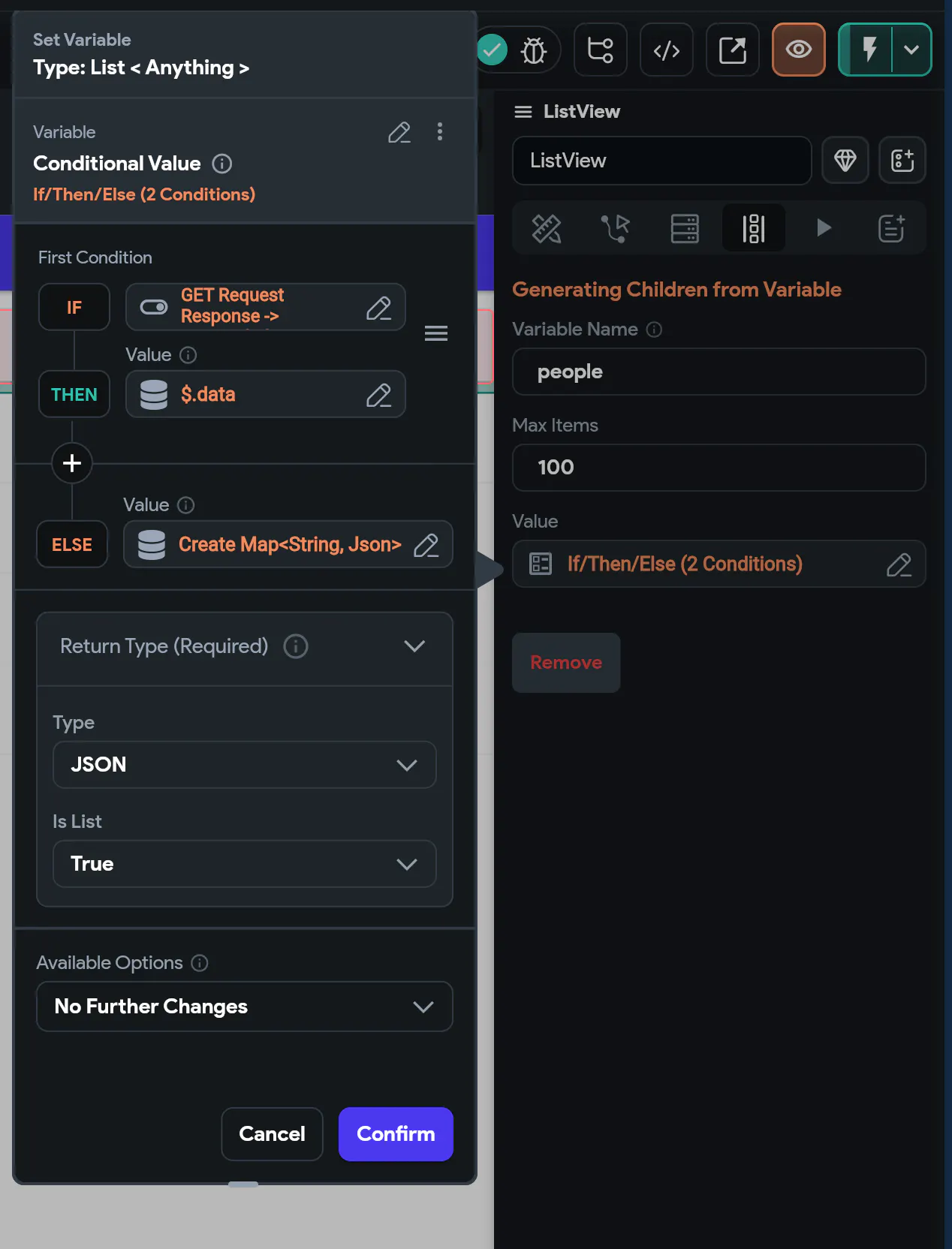 - Generate children from a conditional of the API Call. If response is succeeded, return the $.data path, otherwise, return an empty List;