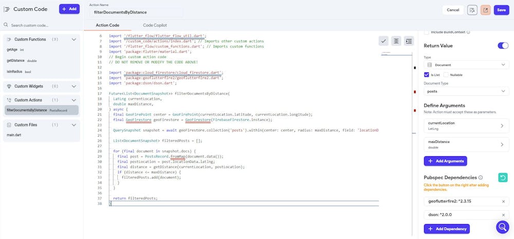 I realized I couldn't do something like that through the query builder within Flutterflow so I tried writing a custom action that will do this for me. I used ChatGPT to write it since I'm not an expert, but I keep getting errors in my code. I've been having issues with dependencies, and different things have been getting highlighted as errors depending on what dependencies I add.