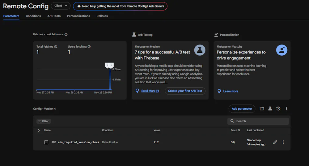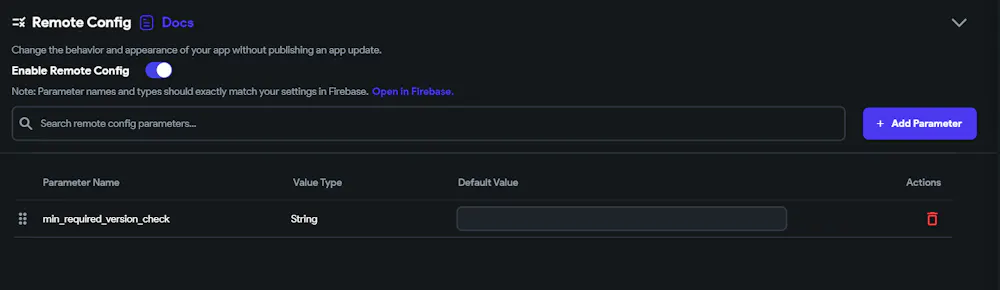 I created a parameter in Firebase Remote Config (min_required_version_check) and published it with value 1.1.2.