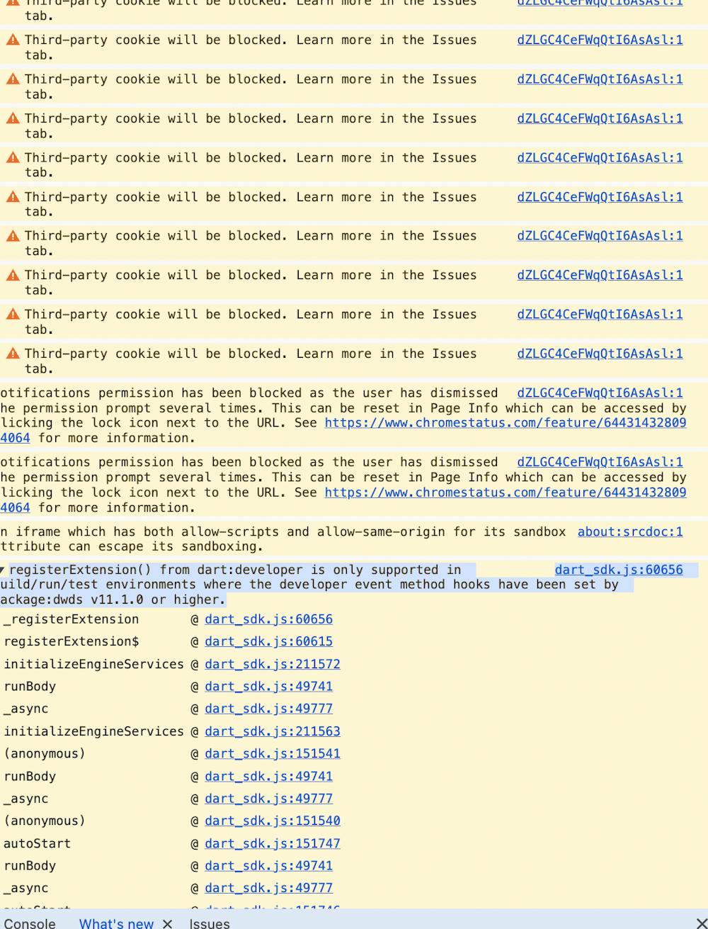 dart_sdk.js:60656 registerExtension() from dart:developer is only supported in build/run/test environments where the developer event method hooks have been set by package:dwds v11.1.0 or higher.