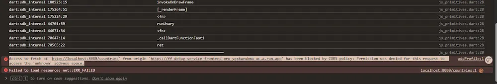 Access to fetch at 'http://localhost:8080/countries' from origin 'https://ff-debug-service-frontend-pro-ygxkweukma-uc.a.run.app' has been blocked by CORS policy: Permission was denied for this request to access the unknown address space.