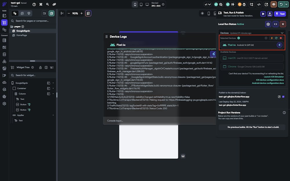 I can't login when testing directly on my physical Android phone with FlutterFlow (connected via USB with developer mode enabled), see caps.