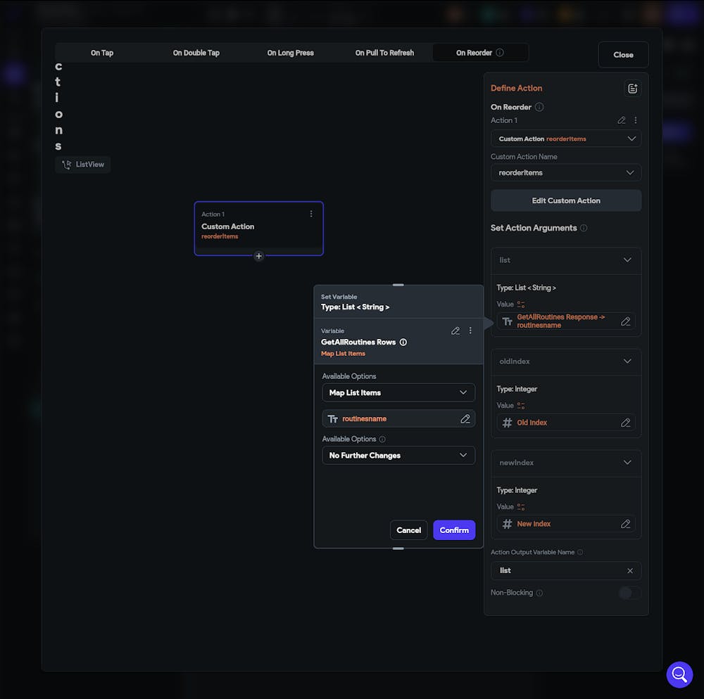 I have a table called routines in my SQLite database with fields routinesref, routinesname, routinesdesc, and routinesorder. In my FlutterFlow app, I've set up a Reorderable ListView that displays items from this table, sorted by routinesorder. After reordering the list items in the UI, I am uncertain how to automatically update the routinesorder field in the database to reflect the new order of items.