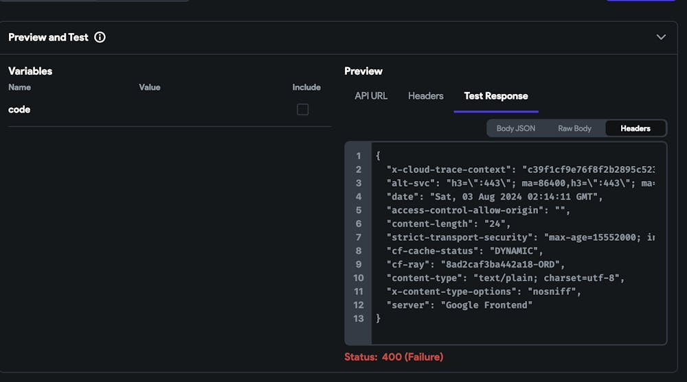 When I run a API call with default code, I get 400 error, and header is clearing showing no authorization defined.