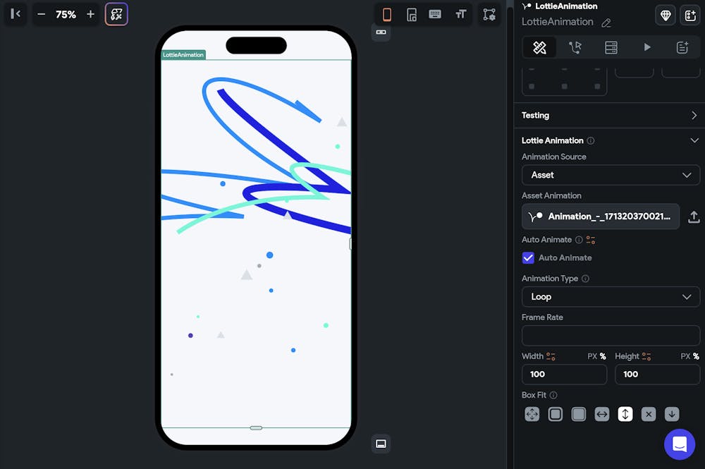 I'm trying to set a Lottie Animation on loop as a background, which should take up the full height and width of the screen. In the UI Builder, the Lottie Animation appears as expected, set inside a container of infinite width and height.