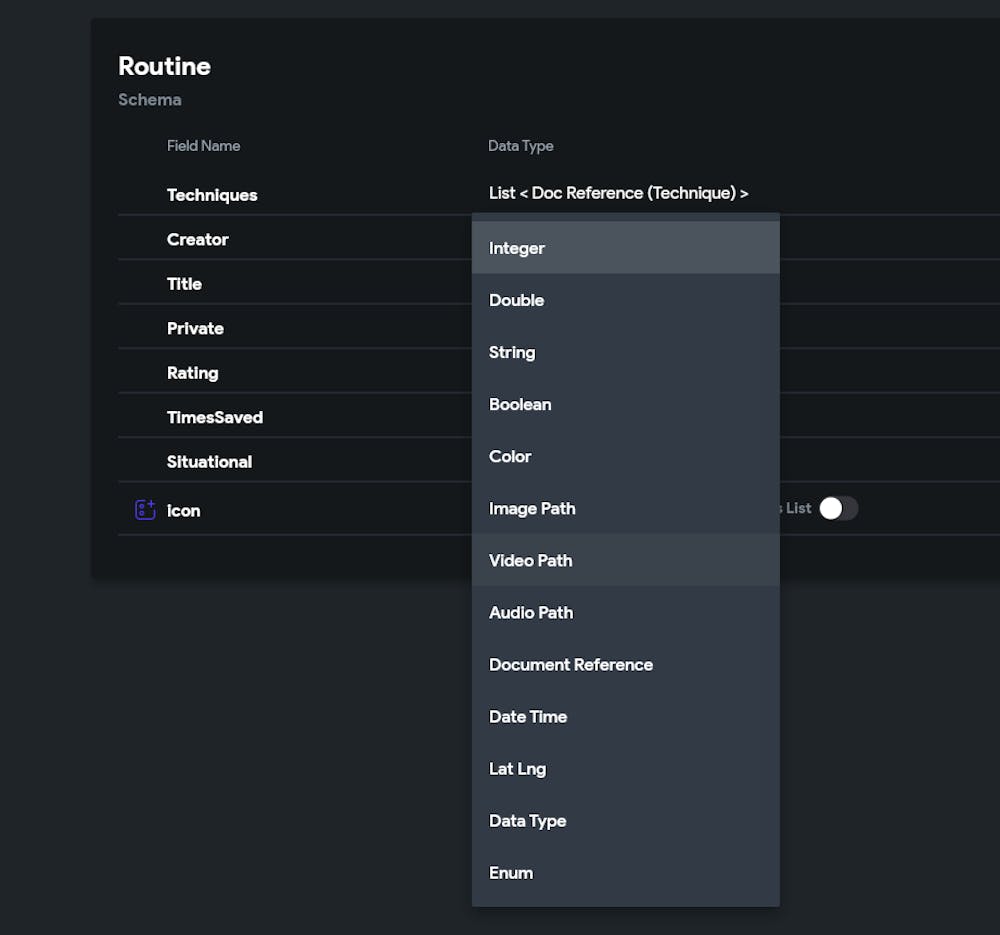 I have a document let's call it "Routine" that the user creates, when they create it they choose an icon to save it in the routine Document in firebase. How would I save this icon in Firebase? in the data types do i need to choose String? or imagePath? I can't find the type Icon in the properties datatype!! am i missing something?