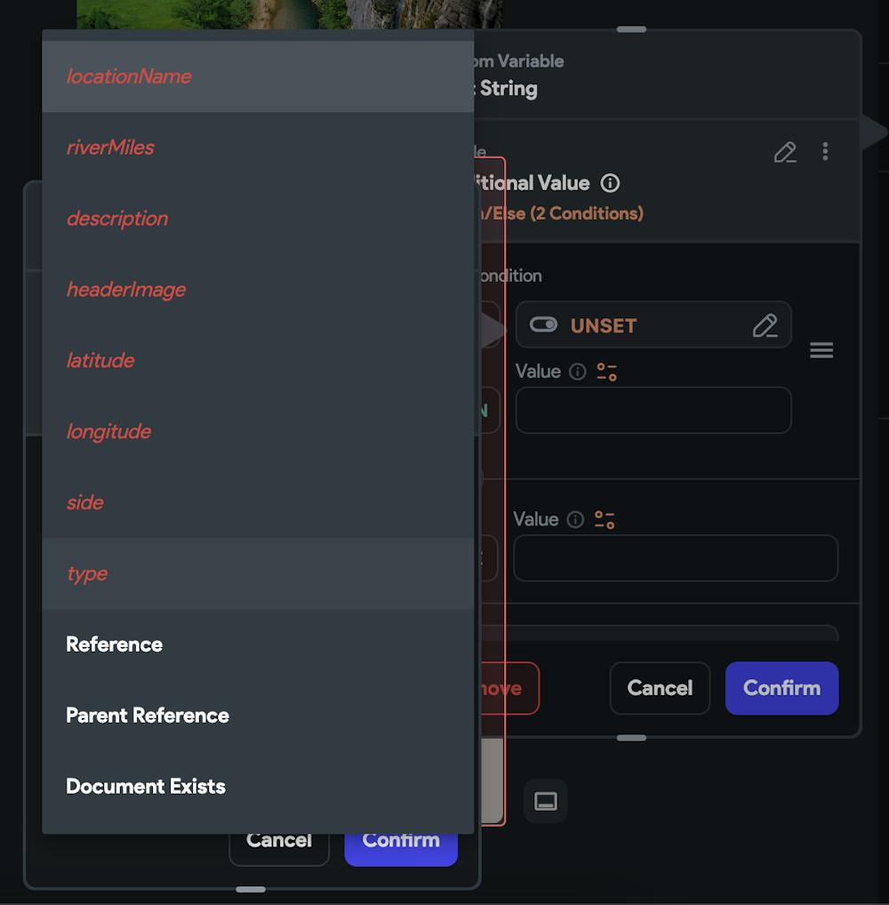 I tried utilizing the 'conditional' functionality in FlutterFlow, but wasn't able to make it work. The idea was to create a system that worked like "If location type = ACCESS_POINT, then "Access Point". Seemed like it should be possible to do, but every way I tried to set it up I was unable to grab the document property 'type' to use as the variable in the IF field. I can only access the Reference, Parent Reference, or Document Exists options (everything else is disabled).