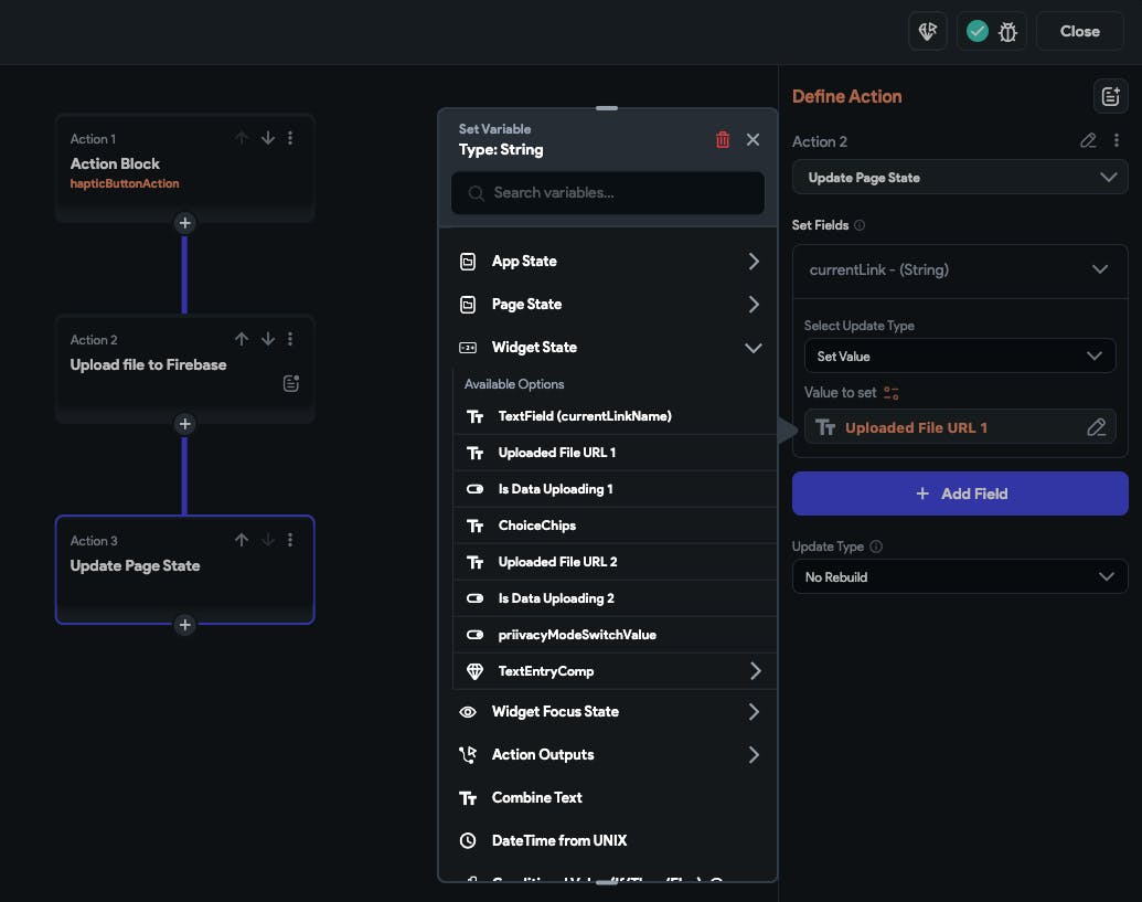 I have a FF project with a page that uploads multiple different items to Firebase (images, PDF files, etc...). After uploading the file to Firebase, I need to store the uploaded file URL in a page state string object. The problem is, there are multiple "Uploaded File URL" strings, one is in reference to the uploaded image and the other in reference to the uploaded PDF file. So how I tell the difference between the two links, which one is which? Have a look at this screenshot to see what I mean: