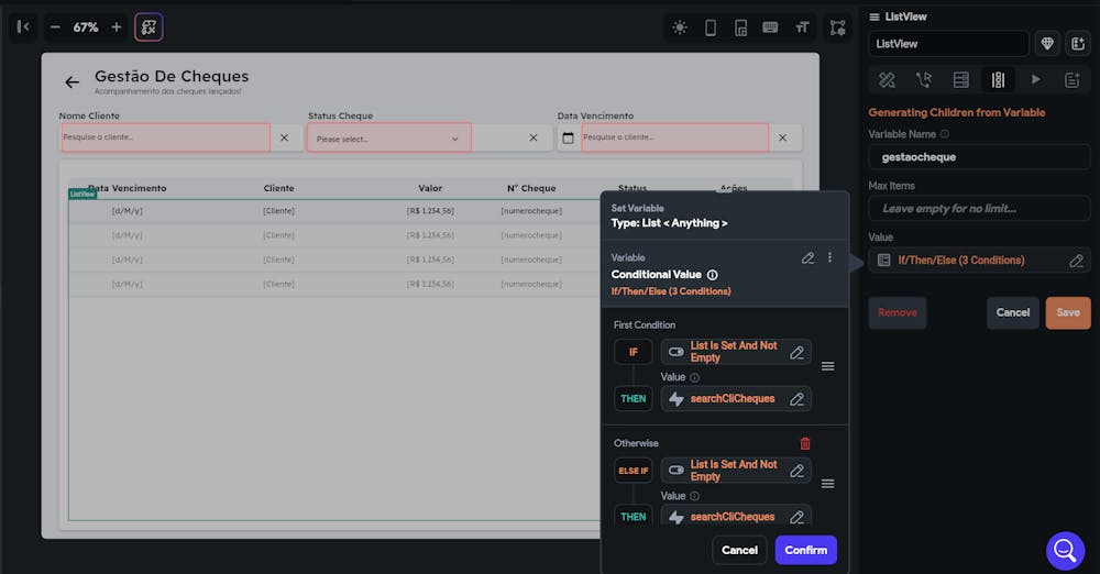 But now I have no idea how to make my DropDawn work in my listview because I'm already using a Generating Dynamic Filter to search for the customer's name when I type it in texfild. Now I don't know where to put the DropDawn one.