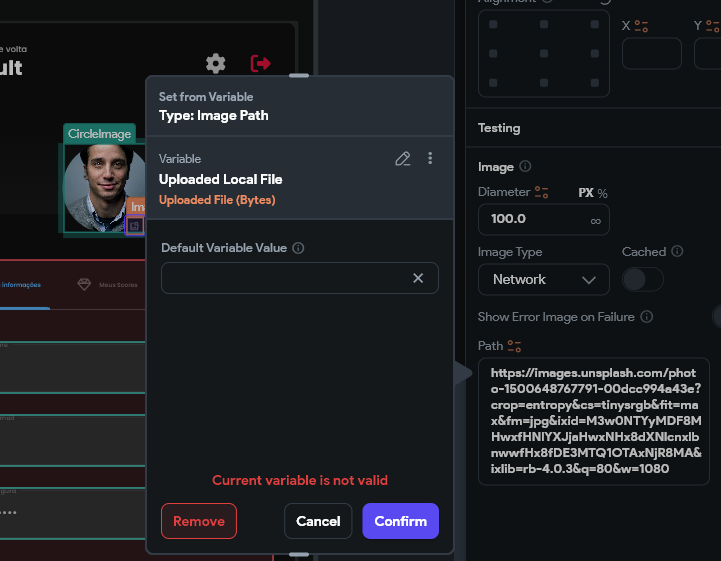 I have a button next to it that when pressed will prompt the user to send an image, when sending this image it should be loaded in this widget with type Network (Image Path), but it seems that I can't associate this type of value.