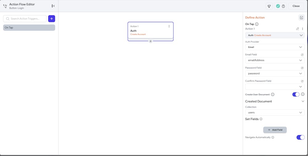 I am facing an issue with the "Create Account" button in my app that is connected to Firebase Authentication for email/password sign-up. Despite setting up the Create Account logic correctly in the Action Flow Editor, the button redirects the user directly to the dashboard even though the account creation process has not been completed.