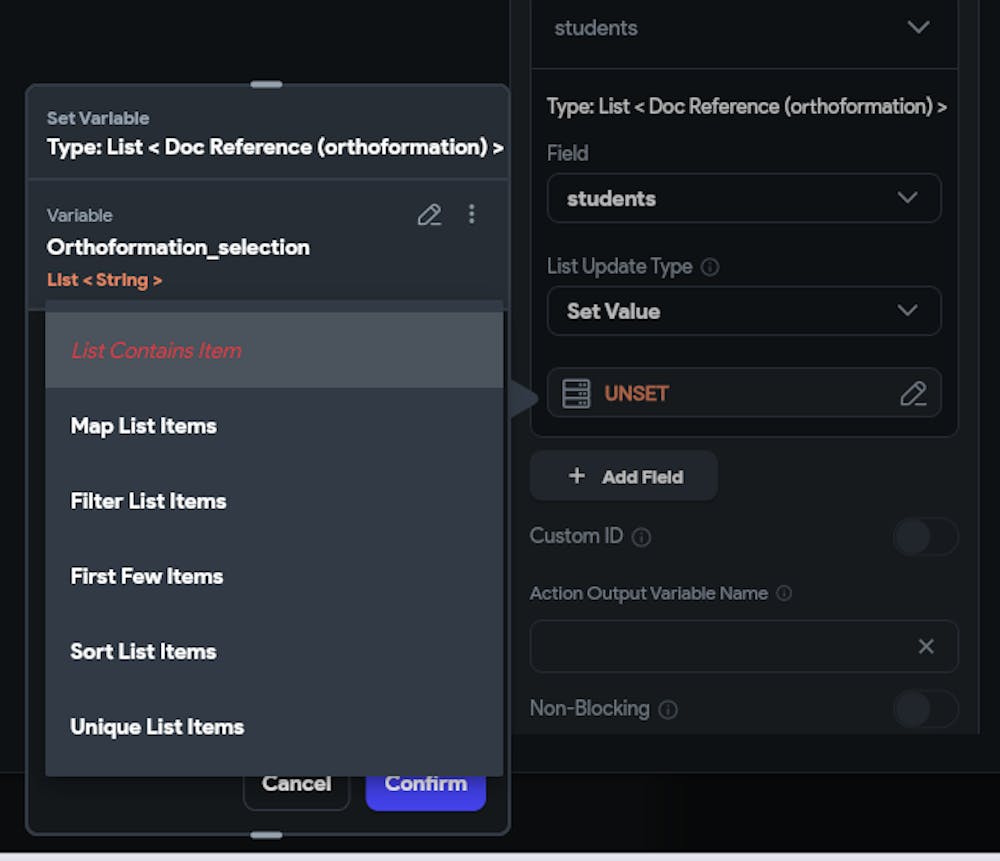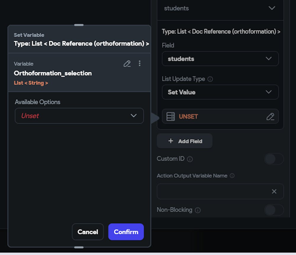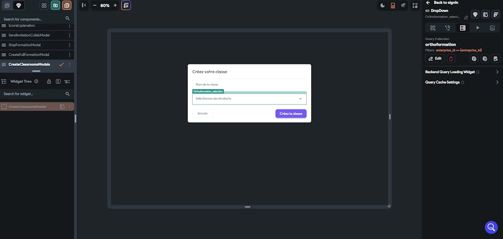 The modal I created. There are two fields : one text area for the name and the multi dropdown I want. This multiple dropdown triggers the "orthoformation" database, whose documents could be in the list I want to fill.