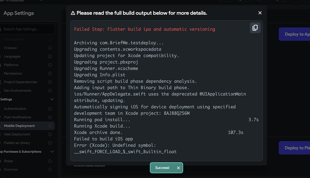 I am not sure where the issue is coming from but I have tried with chatgpt to debug the pubspec dependencies and even tweaking the Podfile to no avail. Anyone experience something similar or know how I can get this published now.