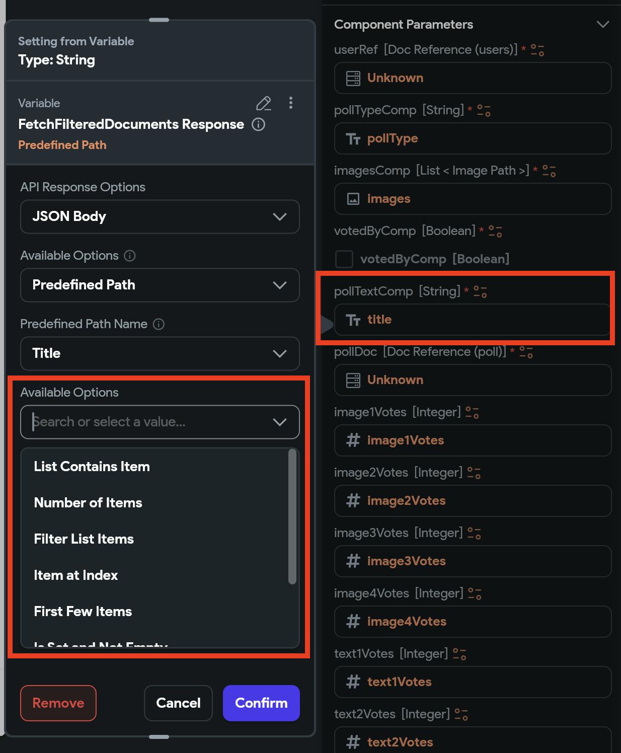 Which means that when I try to map them to the List component parameters, I am not able to do so. Eg. here you can see that I need a "String" but I an getting a "List":