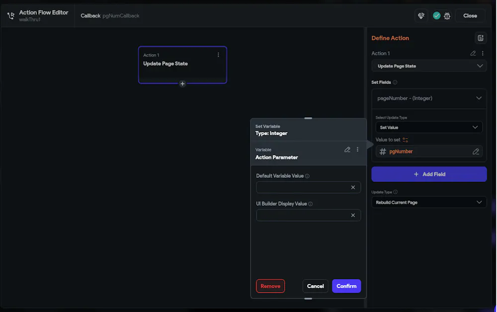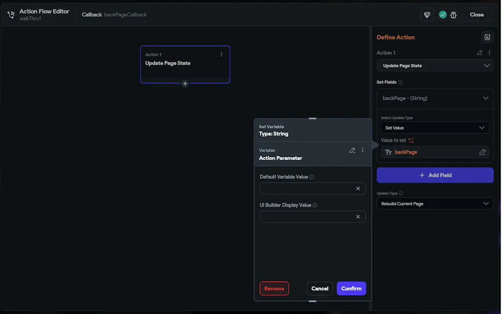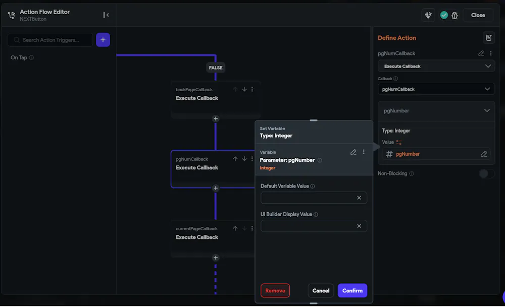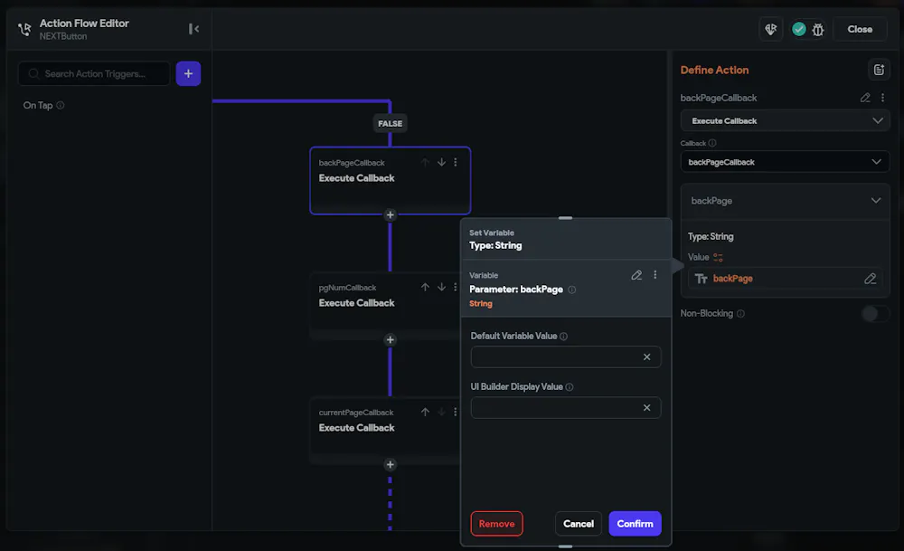 When the NEXT button is tapped, the currentPageCallback updates the "currentPage" Page State string from the Component Parameter named "nextPage". Basically, you're saying the nextPage should become the currentPage. Inside the currentPageCallback is an "Update Page State" action with the "currentPage" Action Parameter data. Remember that inside the Component, the "currentPage" data is drawn from the "nextPage" Component Parameter data. The backPageCallback also updates the "backPage" Page State string from the Component Parameter named "backPage". the pgNumCallback updates the "pgNumber" Page State string from the Component Parameter named "pgNumber".