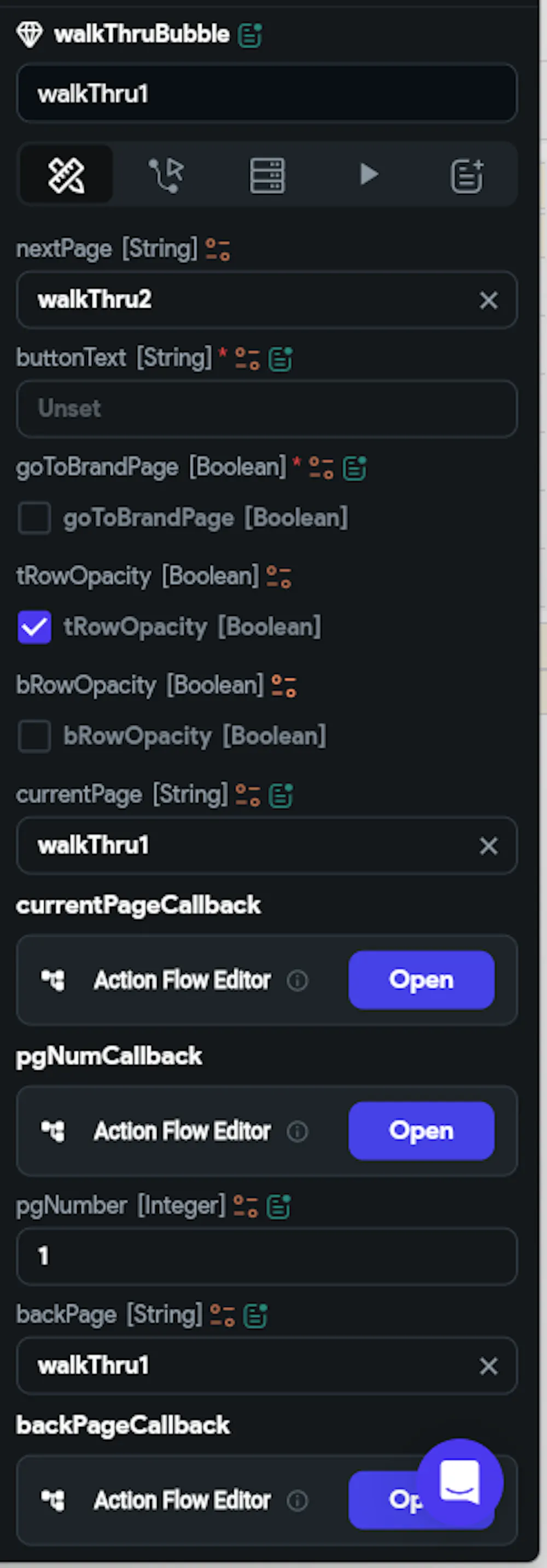 When speaking of a walkthrough page as "a page", that is a Container Widget named "walkThru"-some number that is fully opaque. Each page has a primary Component called "walkThruBubble" that houses all the walkThru code. The walkThruBubble is where the walkThru logic lives, from all the Component Parameters to the Callback Actions, to the NEXT button and so on.
