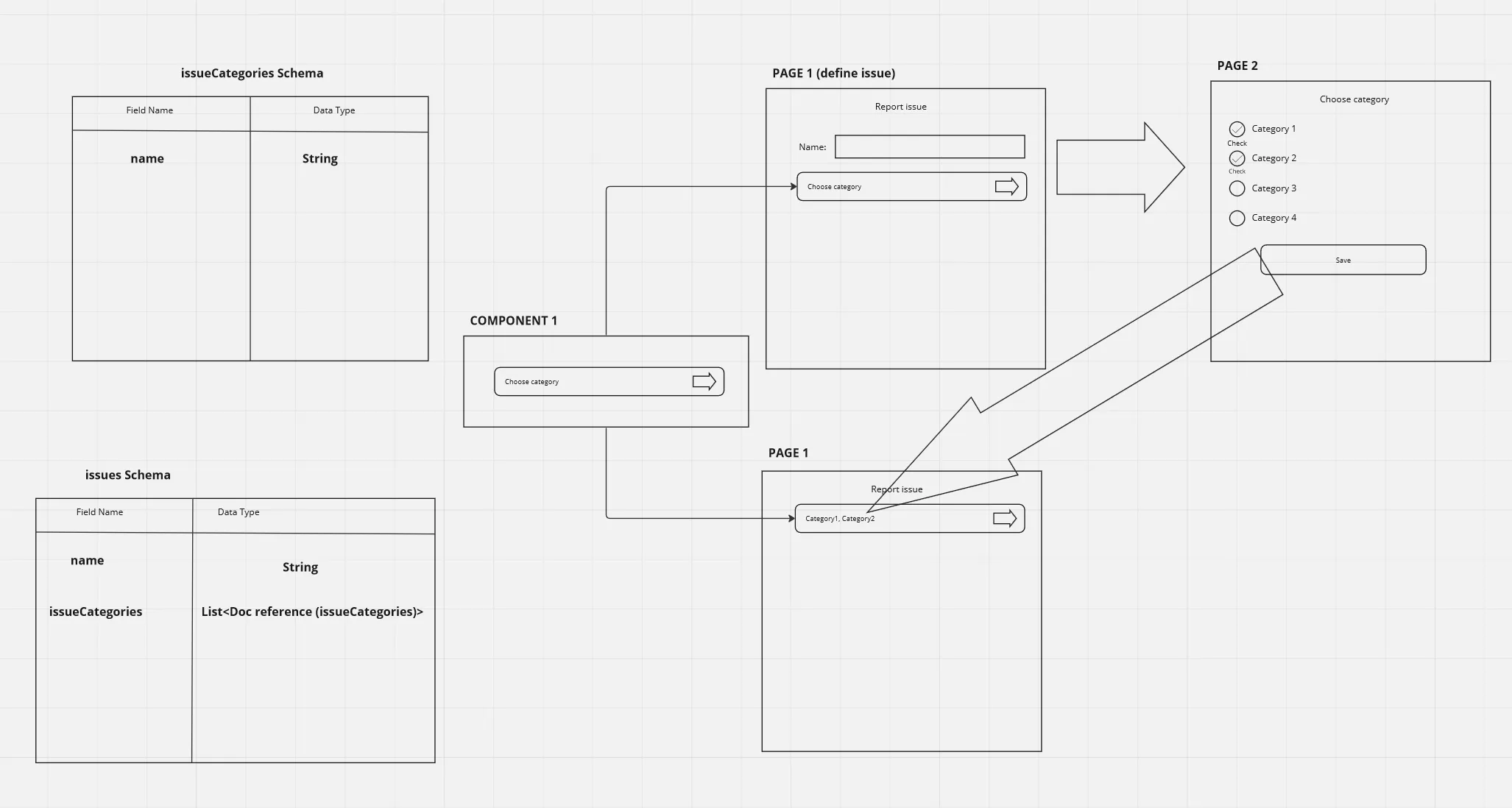 On the left you have veeeeery simplified data structure i have now. More on the right is what i have right now (one component which is used on Page 1 used to define issues) I want this component to show categories assigned to issue. And have the button to category chooser (this is Page 2)