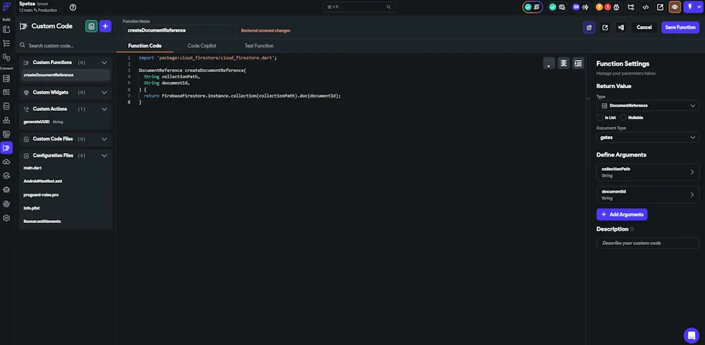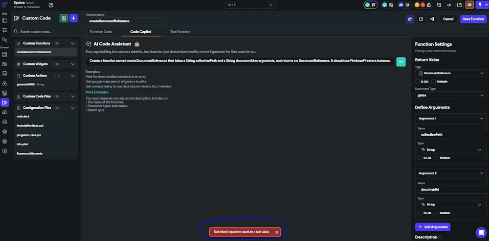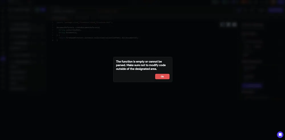 When creating or saving any custom function (e.g., createDocumentReference, formatLatLng, as a function), I consistently receive the error message: