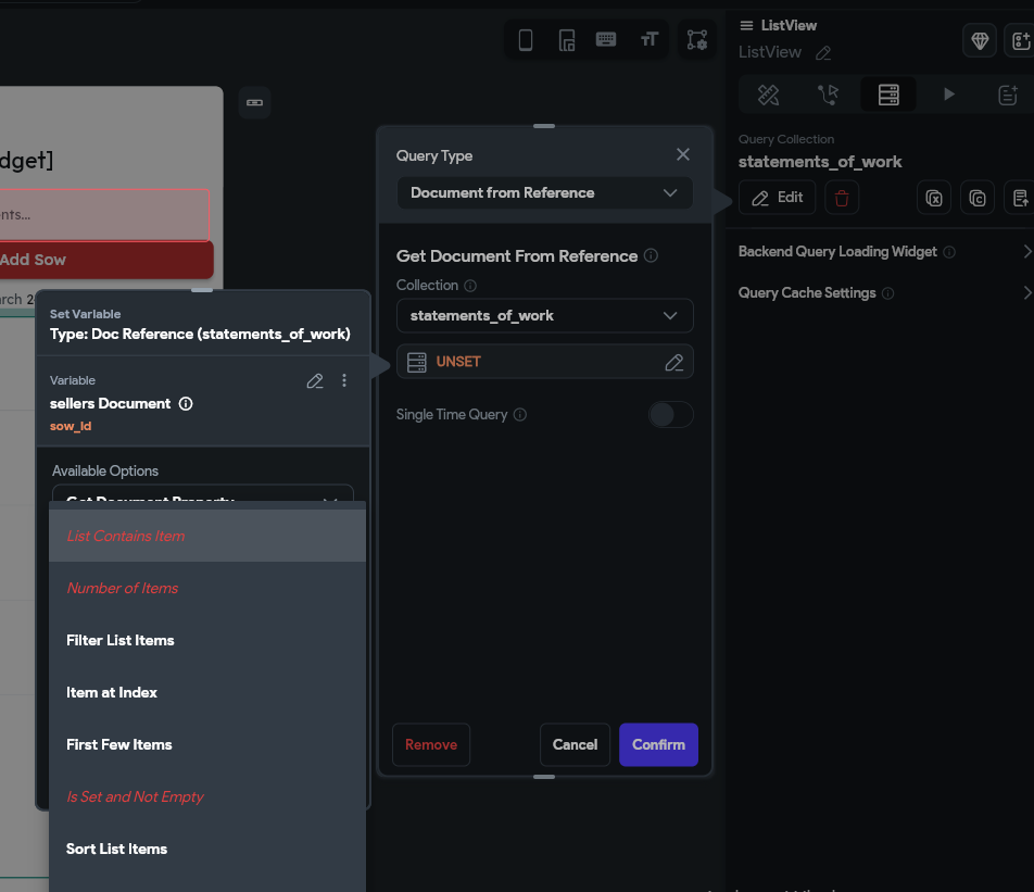 I need to make the listView to loop trough statements_of_work collection but only displaying the ones listed in seller collection docRef list