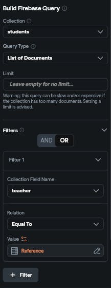 When I put into a ListView the query collection "Students" and filter by "Teacher doc reference", it returns null. I tried also with a custom action, and it is the same, I got data without the filtering.