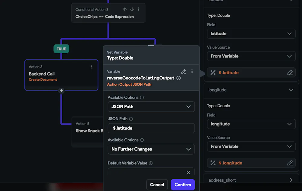 I have a form for users to submit new points on the map, which are populated on the map based on the latitude and longitude coordinates. I have a custom action that makes the API call, parses out the appropriate fields, and populates them in the action output variable. Then, in the action flow, I check for an existing document and, assuming there is no existing document, I create a new document and set the fields accordingly. Everything works right, except for the latitude and longitude coordinates. I can't get them to set, no matter what I do.