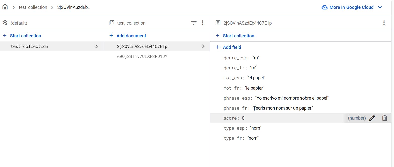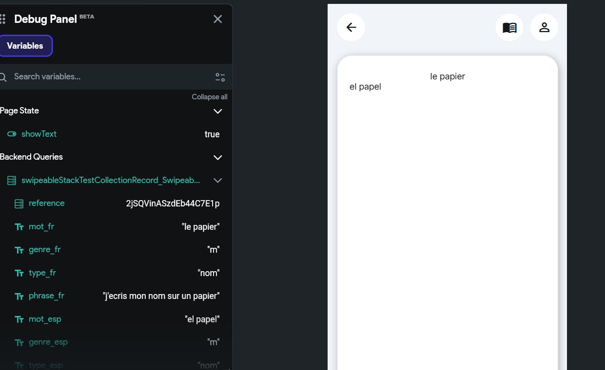 In flutterflow, I have a firestore collection, each document has words in different languages in them. I have a swipeable stack in flutterflow, it display the words from the same document on the swipeablestackpage. see below