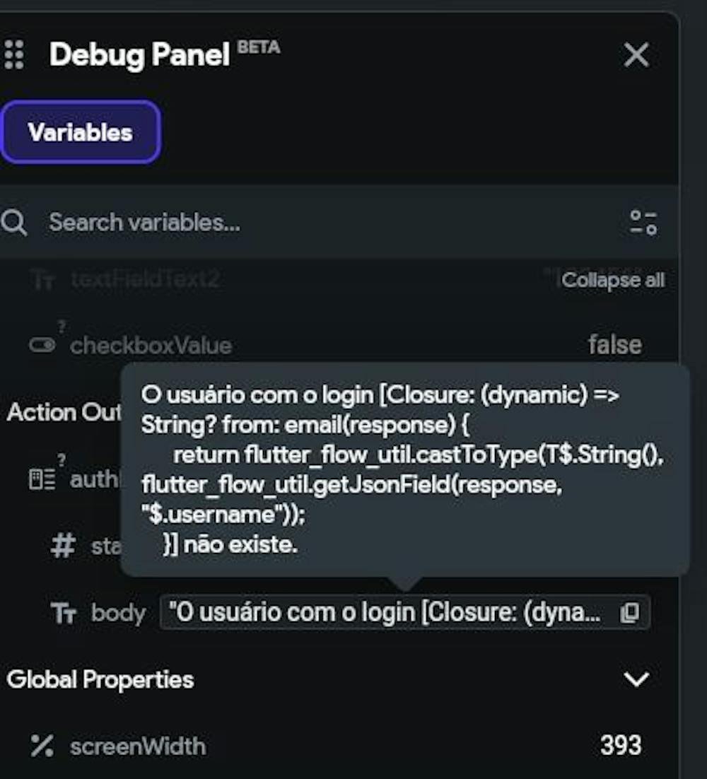 The "O usuário com o login..." and "...não existe" are from by API response, but the issue is related to the code within it: