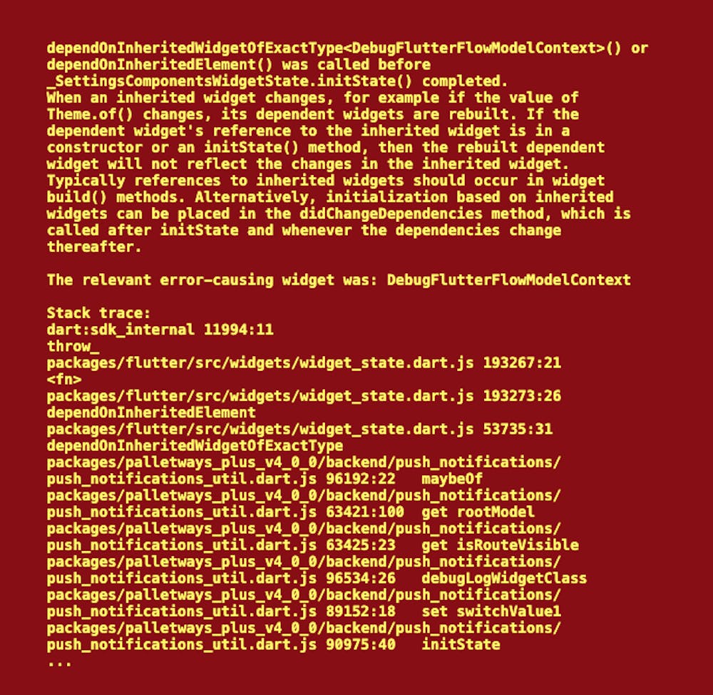dependOnInheritedWidgetOfExactType<DebugFlutterFlowModelContext>() or dependOnInheritedElement() was called before _SettingsComponentsWidgetState.initState() completed.