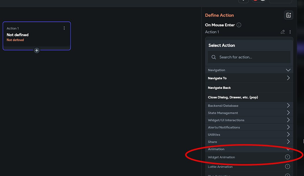 When trying to add a widget animation to a Mouse region I cannot select Widget Animation as it is Grayed out.