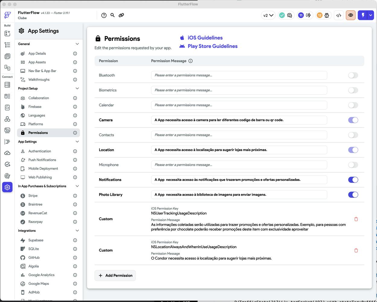 Finally, it is necessary to update the Info.plist file by adding the NSUserTrackingUsageDescription key with a customized message describing the use of data. This configuration is done on the Permissions page.